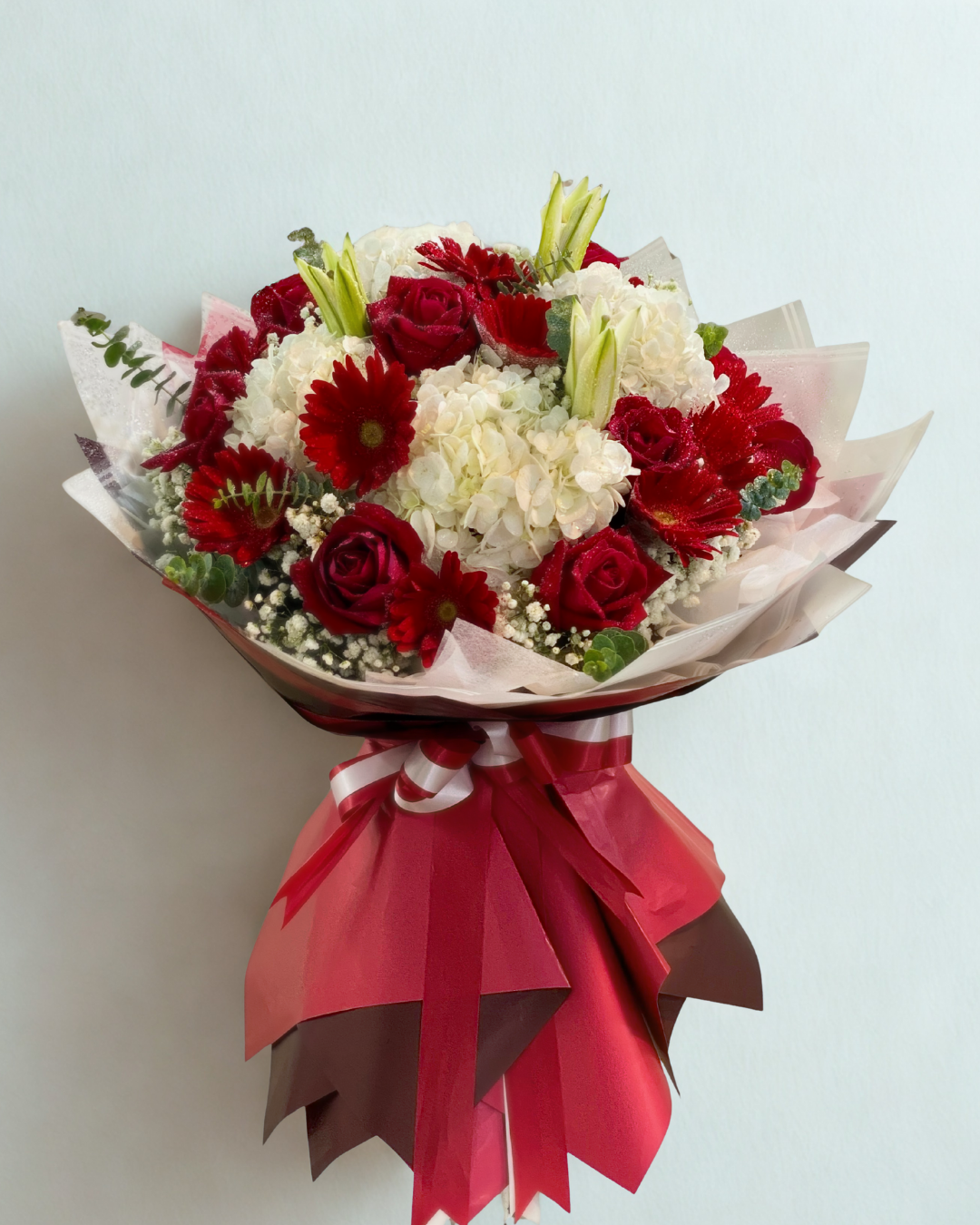 Celebrate life's beautiful moments with Crimson Celebration, a vibrant and joyful bouquet that radiates happiness and love. This stunning arrangement combines passionate red roses, cheerful red gerbera daisies, elegant white hydrangeas, and fresh white lilies, accented with delicate baby's breath and eucalyptus. Wrapped in sophisticated blush and burgundy paper with luxurious red satin ribbons, this bouquet is a perfect expression of joy and celebration.
