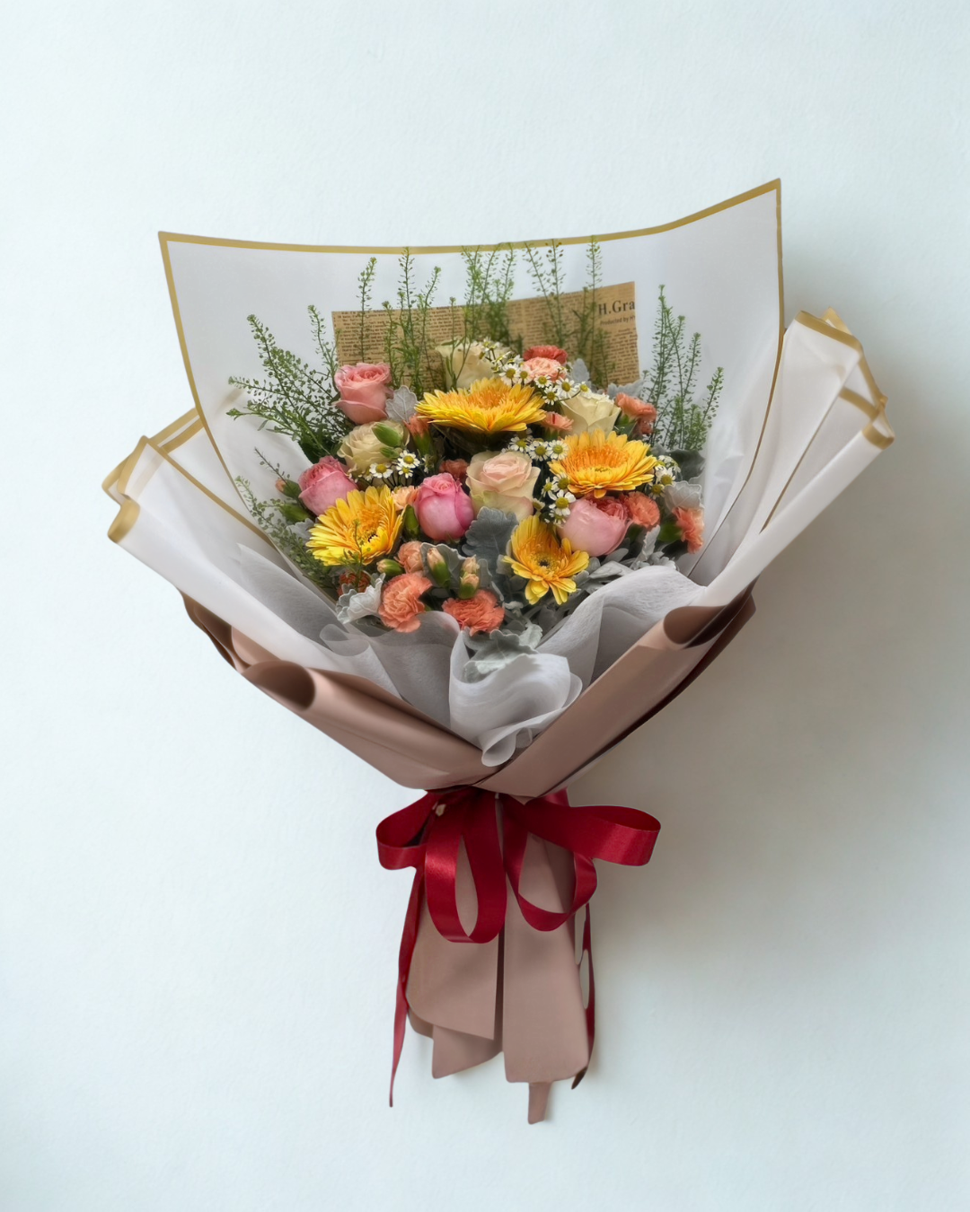 Embrace the warmth of Golden Moments, a charming mixed bouquet that radiates joy and comfort. This delightful arrangement features vibrant yellow spider mums, soft pink roses, delicate spray roses, and cheerful daisies, accented with dusty miller and airy green fillers. Wrapped in sophisticated white paper with gold trim and complemented by elegant brown and burgundy ribbons, this bouquet brings a touch of sunshine and elegance to any occasion.