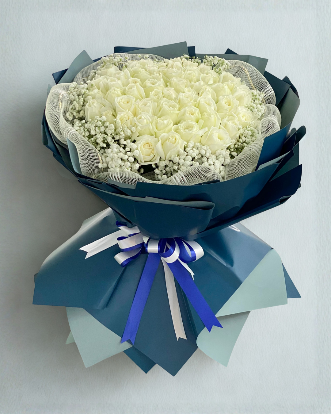 Experience pure elegance with Heavenly Clouds, a breathtaking grand bouquet featuring dozens of pristine white roses arranged in perfect harmony. This luxurious arrangement showcases the timeless beauty of premium white roses, delicately framed with baby's breath and elegant white tulle netting. Wrapped in sophisticated navy blue and light blue paper with matching ribbons, this magnificent bouquet is a stunning symbol of purity, devotion, and everlasting love.