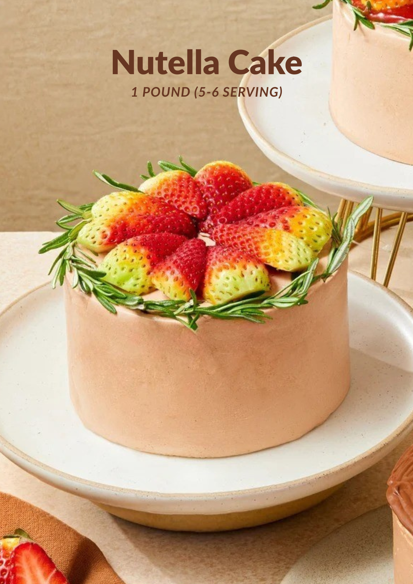 Indulge in the ultimate chocolate experience with our Nutella Strawberry Classic. This decadent cake features rich Nutella frosting topped with fresh red strawberries and aromatic rosemary garnish. A perfect combination of creamy chocolate hazelnut goodness and fruity freshness that melts in your mouth.