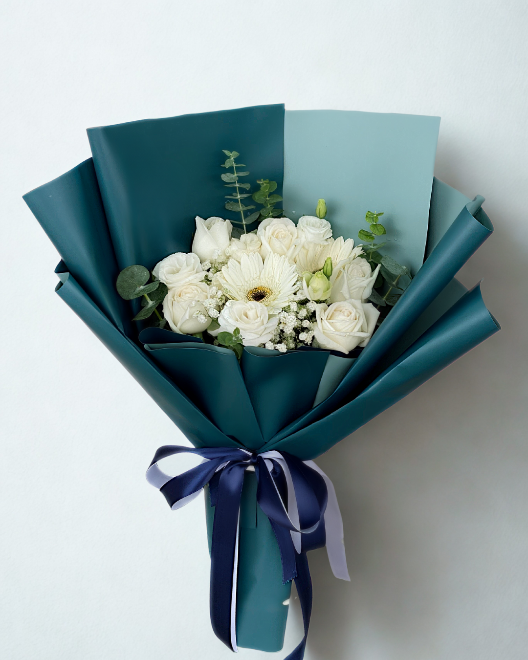 Experience tranquility and elegance with Ocean Breeze, a stunning bouquet that captures the peaceful beauty of pristine white blooms against a sophisticated teal backdrop. This refined arrangement features premium white roses, cheerful white gerbera daisies, delicate white eustoma, and fresh eucalyptus, all harmoniously composed to create a serene and luxurious presentation. Wrapped in our signature dual-tone teal and light blue paper with navy ribbons, this bouquet embodies purity, grace, and timeless sophistication.