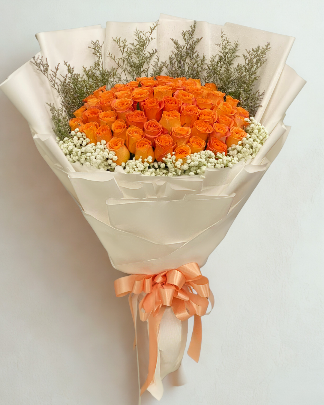 Brighten their day with Orange Crush, a spectacular bouquet bursting with vibrant orange roses that radiate warmth and joy. This stunning arrangement features dozens of premium orange roses perfectly complemented by delicate baby's breath and natural caspia accents. Wrapped in elegant ivory paper with a matching orange satin ribbon, this bouquet is a celebration of happiness, enthusiasm, and positive energy.