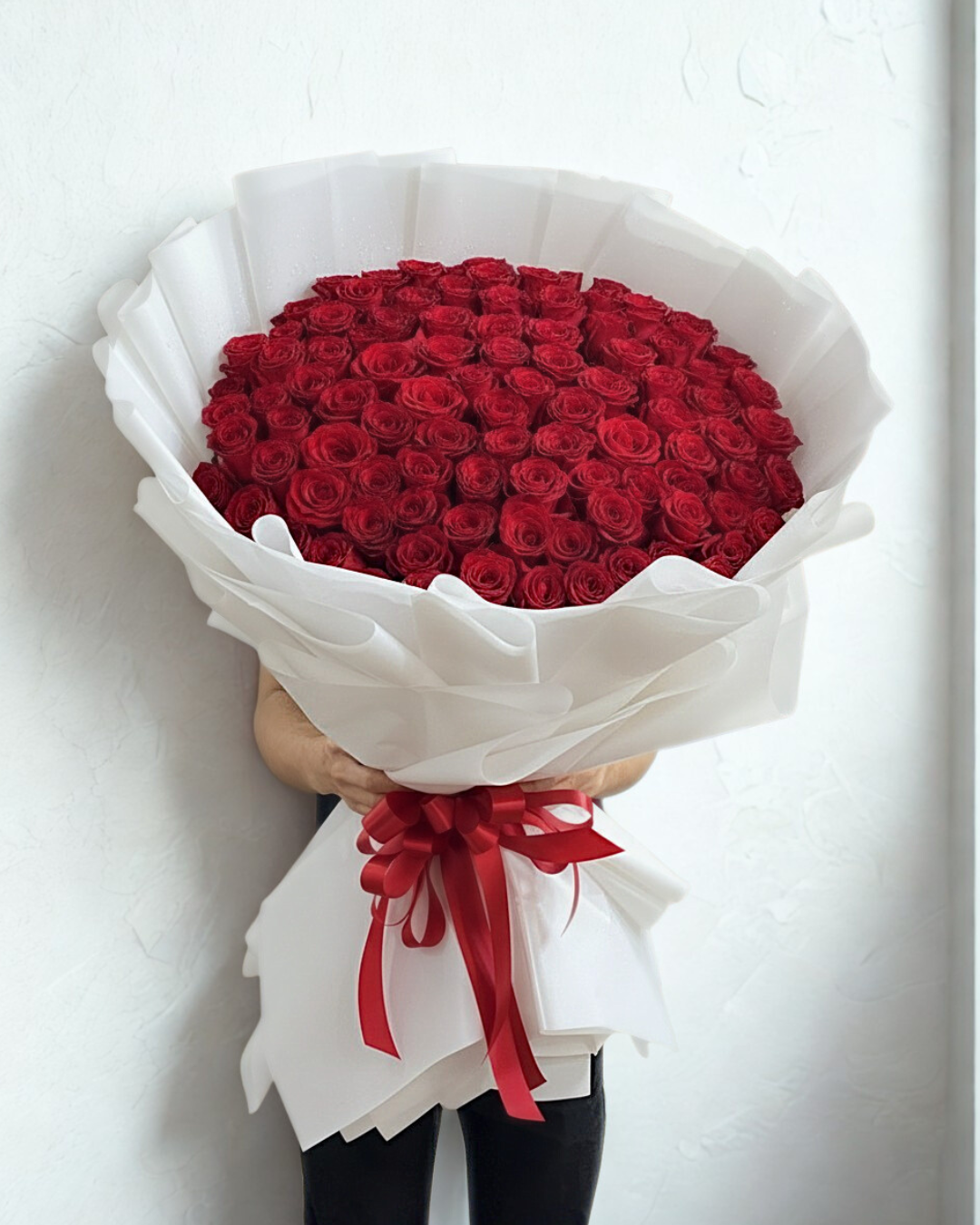 When only the most extraordinary gesture will do, our Pure Forever Love bouquet stands as the ultimate testament to boundless devotion. This magnificent masterpiece features one hundred premium deep red roses, each one carefully selected and expertly arranged to create a spectacular sea of crimson passion that simply cannot be ignored. This isn't just a bouquet - it's a grand declaration, a promise of forever, and a moment that will be etched in memory for a lifetime. The massive dome of perfectly formed roses is elegantly wrapped in layers of pristine white matte paper and finished with a luxurious red satin ribbon. Requiring both hands to hold and filling an entire room with its presence, this is the most powerful way to say "I love you" - a gesture so grand, so stunning, that it leaves no doubt about the depth of your feelings.