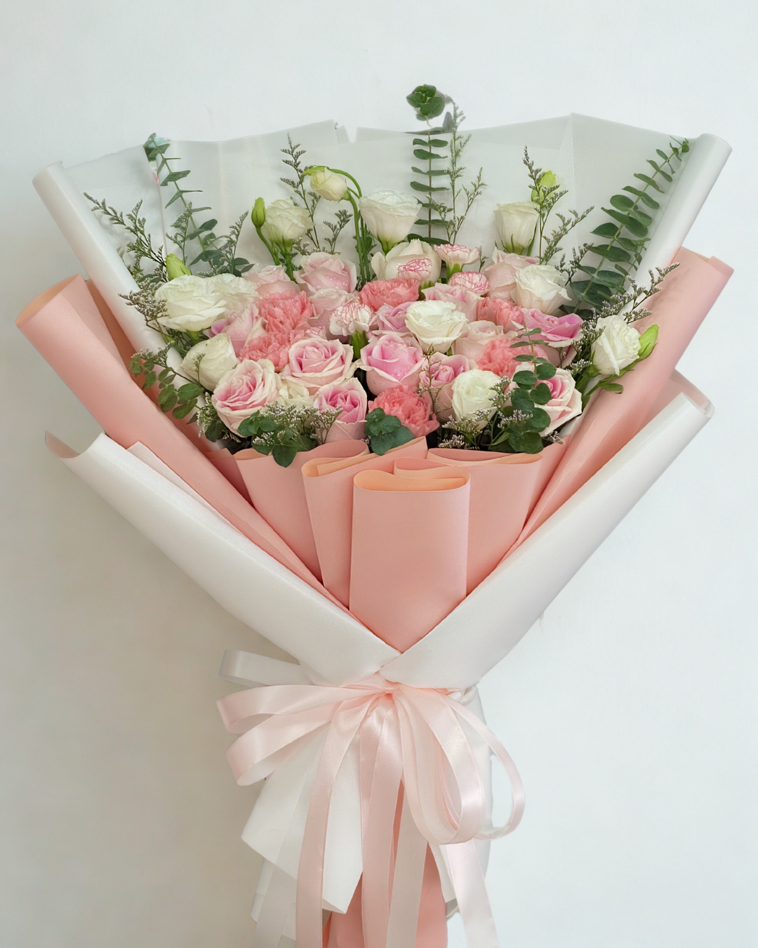 Experience pure elegance with Soft Whispers, a dreamy bouquet that captures the essence of gentle romance and refined sophistication. This enchanting arrangement features a harmonious blend of soft pink roses, pristine white roses, delicate pink carnations, cream lisianthus, and fresh eucalyptus, all beautifully composed to create a serene and luxurious presentation. Wrapped in our signature double-layer pink and white paper with matching ribbons, this bouquet whispers sweetness and grace with every bloom.