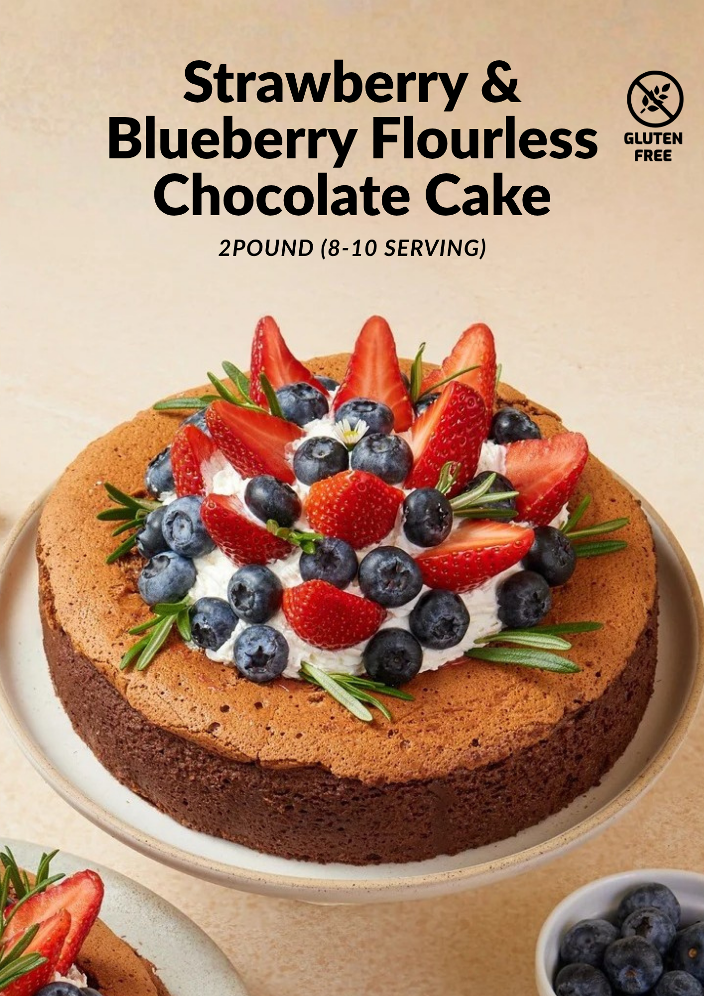 Indulge guilt-free with our Strawberry & Blueberry Flourless Chocolate Cake, a stunning combination of rich chocolate and fresh berries that's completely gluten-free! This heavenly dessert features a dense, fudgy chocolate base topped with fluffy cream, fresh strawberries, and plump blueberries, finished with aromatic rosemary. A perfect balance of decadent chocolate and refreshing fruit flavors.